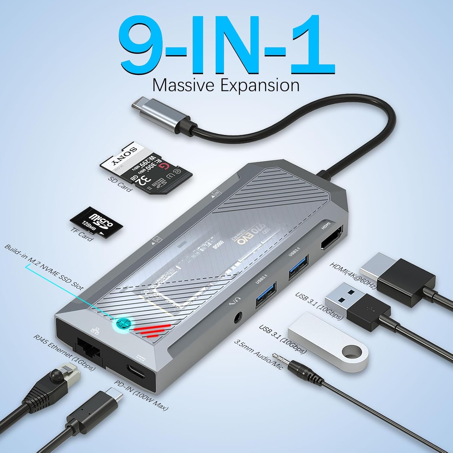 Концентратор USB-C 9-в-1 с корпусом SSD для разветвителя HDMI M.2 NVMe 4K, 60 Гц — это многофункциональное устройство расширения, предназначенное для расширения возможностей подключения ноутбуков, планшетов и других устройств, совместимых с USB-C. Он объединяет девять основных функций в одном компактном блоке, позволяя пользователям подключать несколько периферийных устройств, сохраняя при этом высокоскоростную передачу данных и надежную подачу питания.