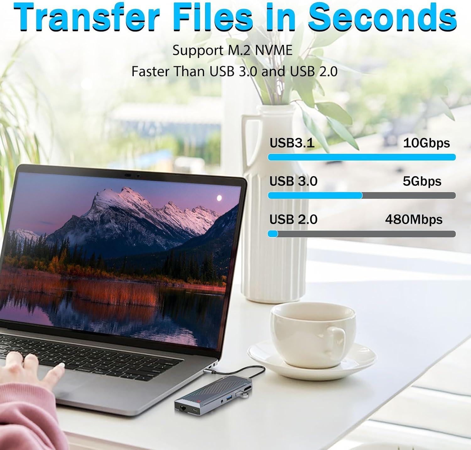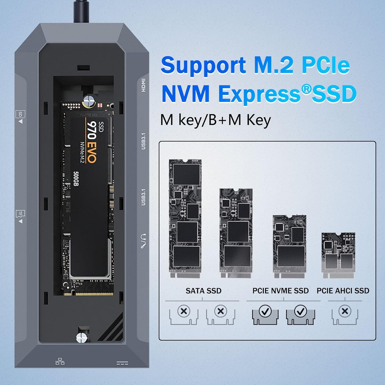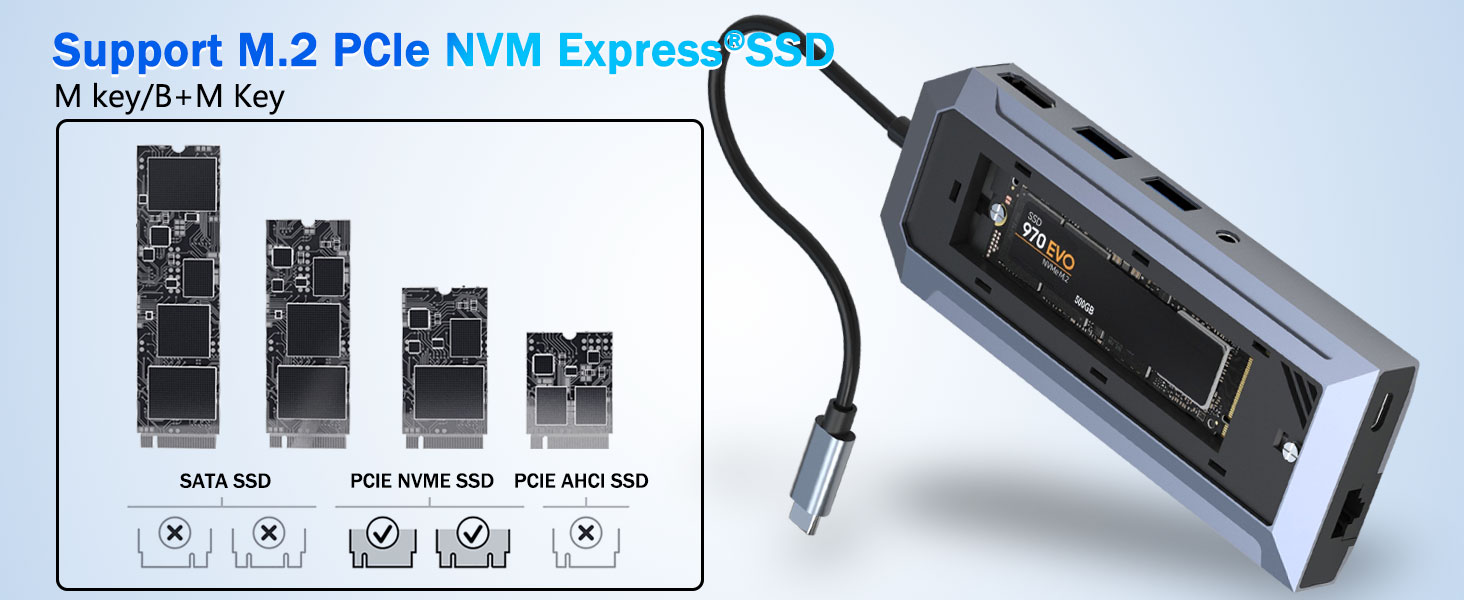 В отличие от традиционных USB-концентраторов, это устройство включает в себя специальный корпус SSD, поддерживающий твердотельные накопители M.2 NVMe. Эта функция позволяет пользователям добавлять высокоскоростное хранилище непосредственно в свое рабочее пространство без необходимости использования отдельного внешнего диска.