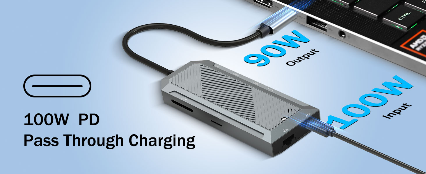 Поддержка подачи питания гарантирует, что устройства останутся заряженными во время использования концентратора. Порт USB-C PD позволяет передавать питание через концентратор на подключенный ноутбук или планшет.
