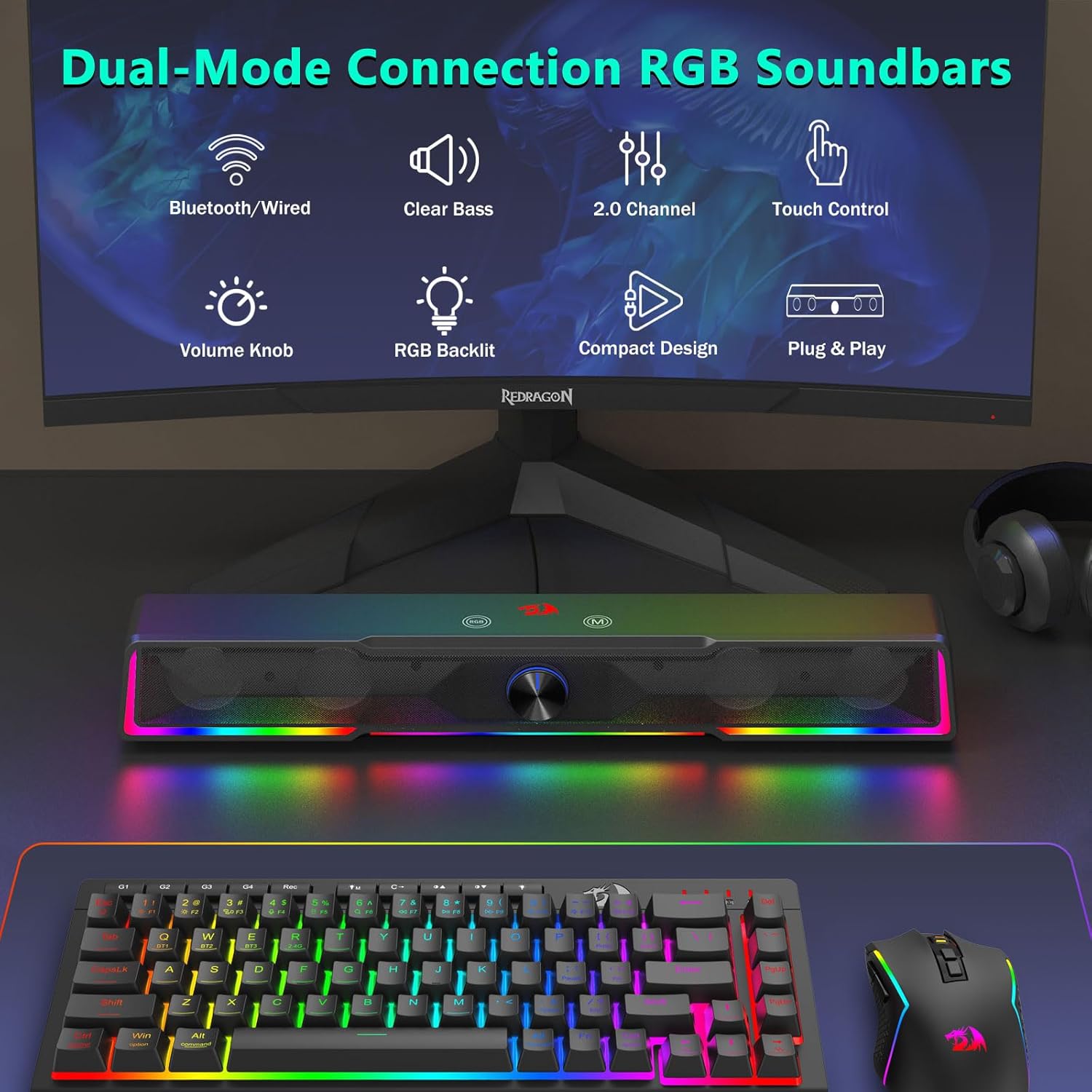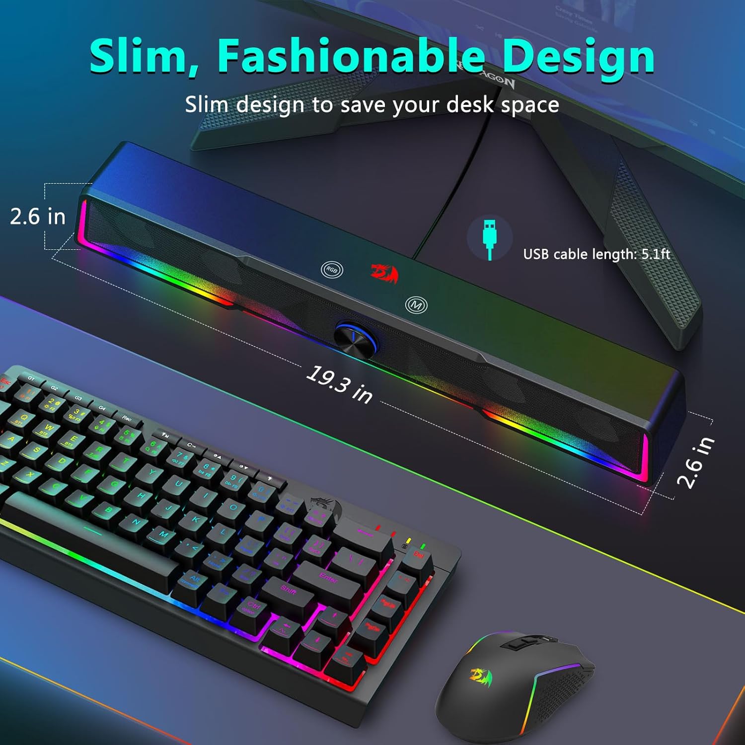Компактный дизайн, удобный для использования на столе Расположение звуковой панели уменьшает беспорядок, сохраняя при этом мощный звук.