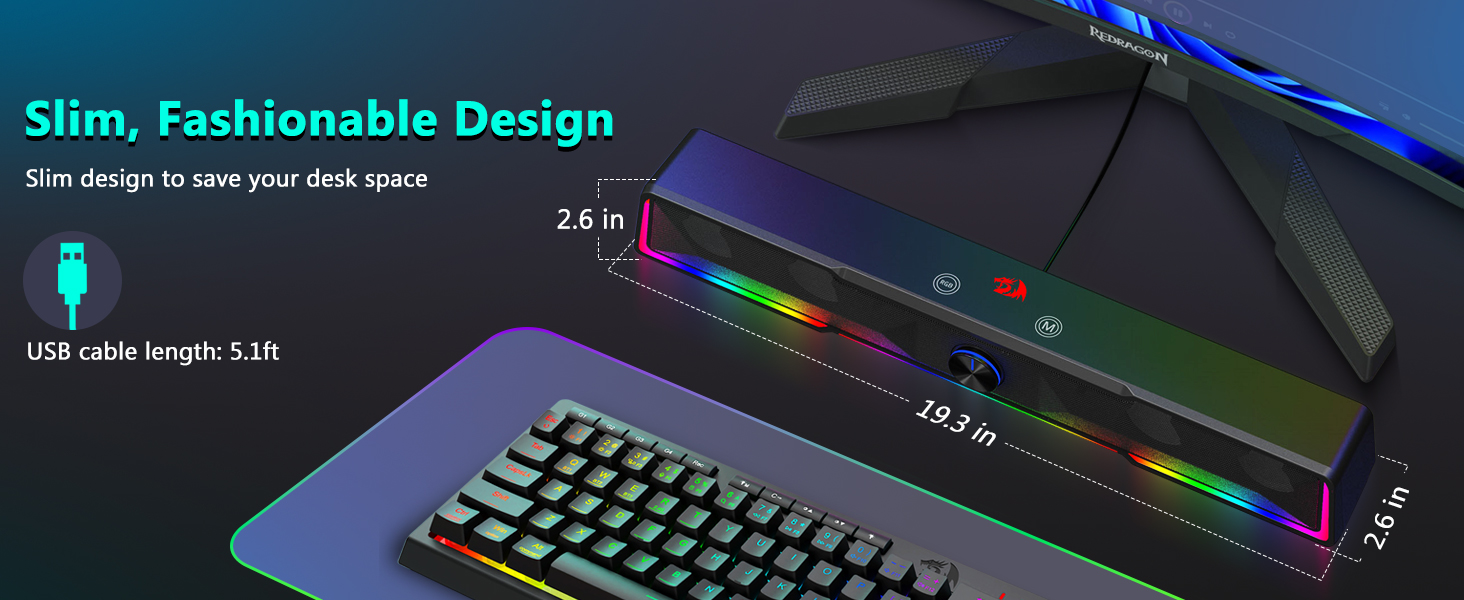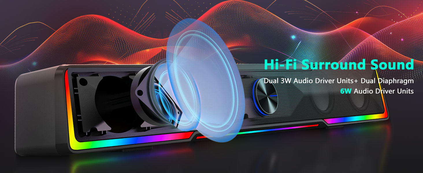 Компактная конструкция звуковой панели В отличие от традиционных динамиков, которые занимают большие площади по обе стороны монитора, черный компьютерный динамик звуковой панели с проводным подключением через Bluetooth/USB имеет тонкую конструкцию звуковой панели, которая удобно помещается под большинством компьютерных экранов. Этот компактный дизайн помогает поддерживать чистоту и порядок на рабочем столе, сохраняя при этом насыщенный и захватывающий звук.