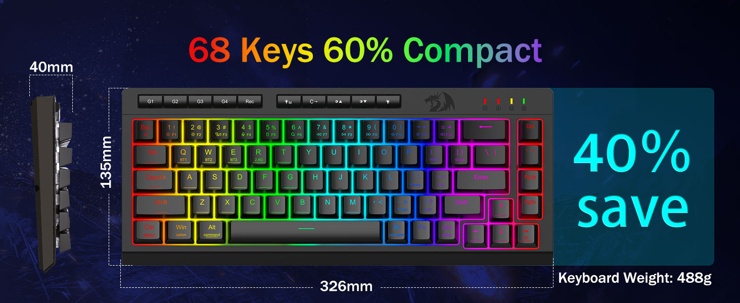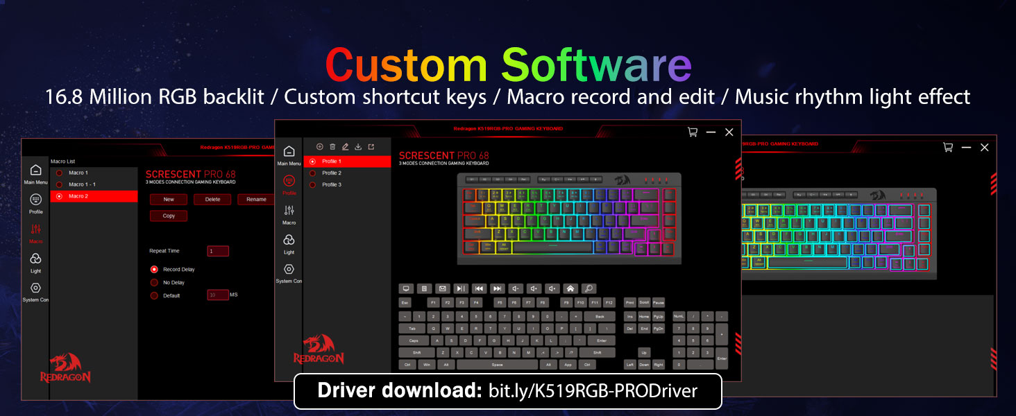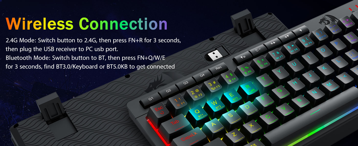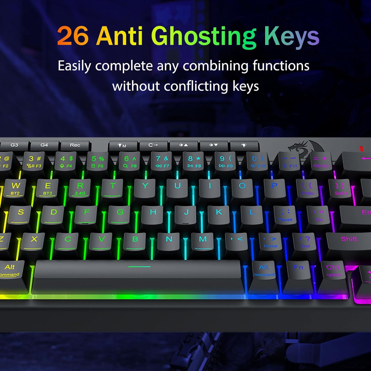Портативная беспроводная игровая клавиатура Black K519 Pro от Redragon, изготовленная Chuangquan, является примером разработки профессионального уровня как для геймеров, так и для профессионалов. Его универсальная трехрежимная конструкция поддерживает стабильное соединение Bluetooth, беспроводное соединение 2,4 ГГц с малой задержкой и проводное соединение USB-C, что позволяет легко переключаться между тремя устройствами одновременно. Клавиатура оснащена специальными макроклавишами, которые можно полностью настроить с помощью интуитивно понятного программного обеспечения, что позволяет пользователям назначать сложные команды или сочетания клавиш для повышения производительности и эффективности игр. Динамическая RGB-подсветка с множеством эффектов персонализирует настройку, а одновременное нажатие N клавиш и защита от ореолов гарантируют, что каждое нажатие клавиши точно регистрируется во время интенсивных сеансов.