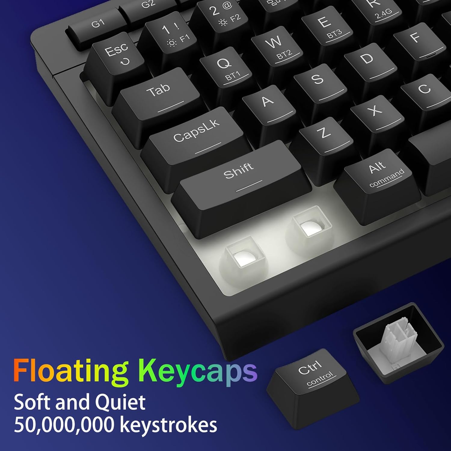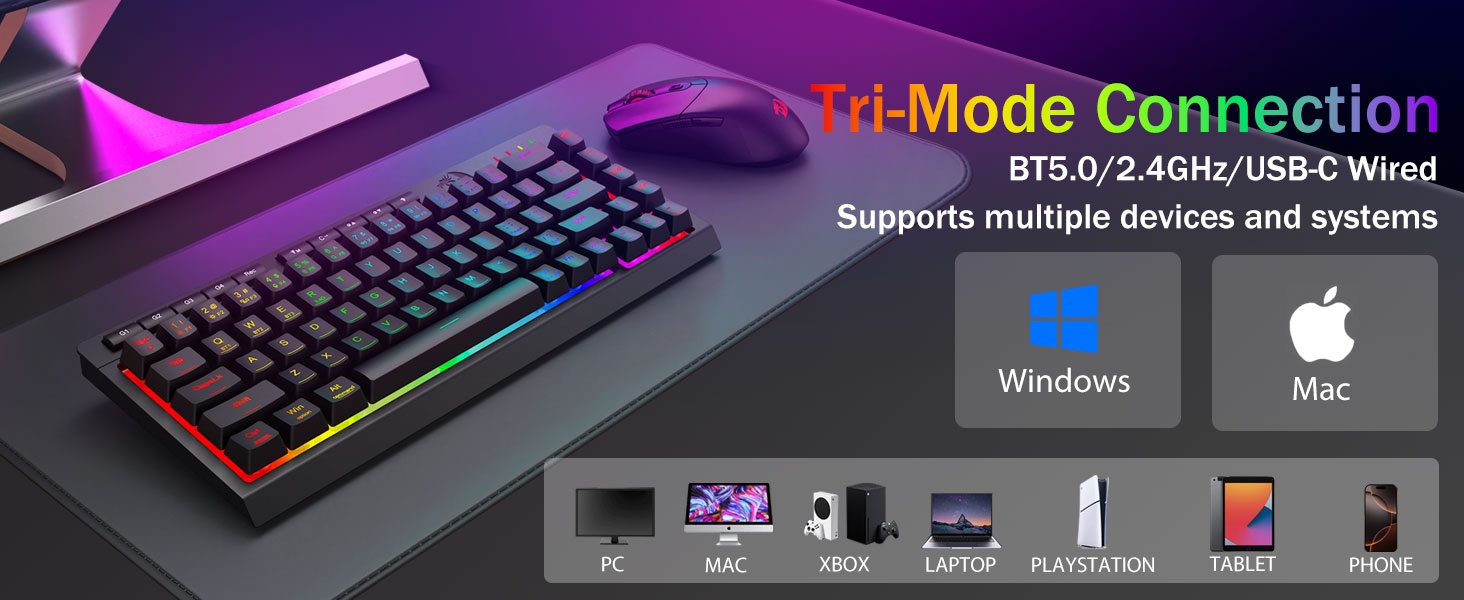 Профессиональная игровая производительность и специальные элементы управления с подсветкой —Легко переключайтесь между Bluetooth 5.0, беспроводным режимом 2,4 ГГц или проводным режимом USB-C, подключая до 5 устройств одновременно (ПК, Mac, планшеты, телефоны, PS/XBOX). Легко переключайте устройства с помощью сочетаний клавиш или боковой кнопки — идеально подходит для гибридных настроек работы и игр. Оставайтесь на связи в течение нескольких недель благодаря аккумулятору емкостью 4000 мАч (30+ дней в режиме ожидания, 50 часов работы в режиме RGB).