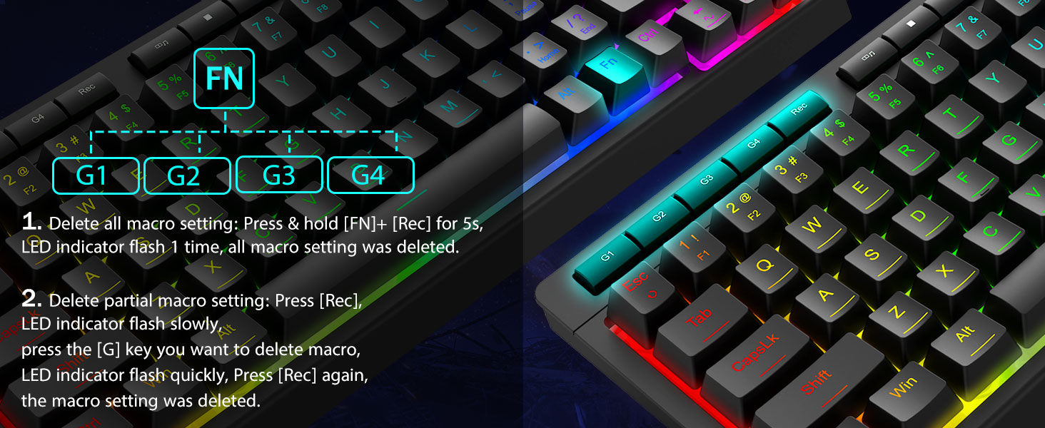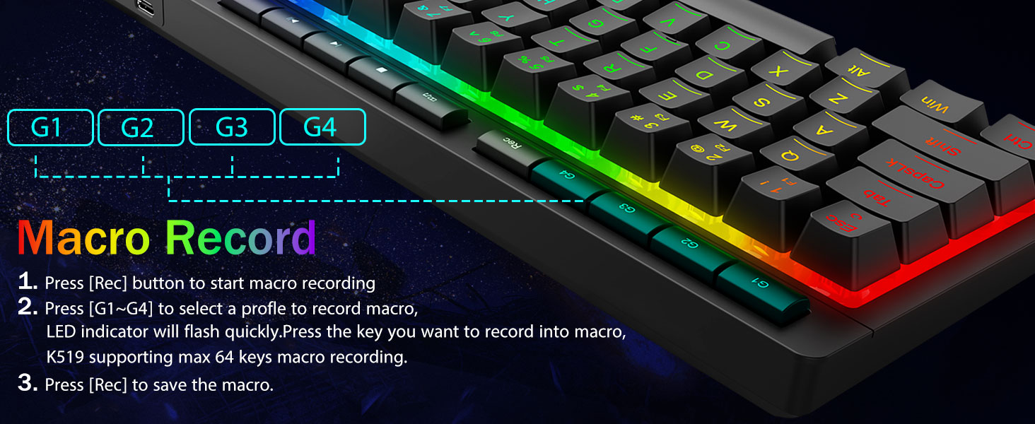 4 встроенные макроклавиши- 4 встроенные макроклавиши (G1~G4) программируются и работают «на лету» без какого-либо дополнительного программного обеспечения. Клавиши легко редактируются и позволяют выполнять множество различных макросов.