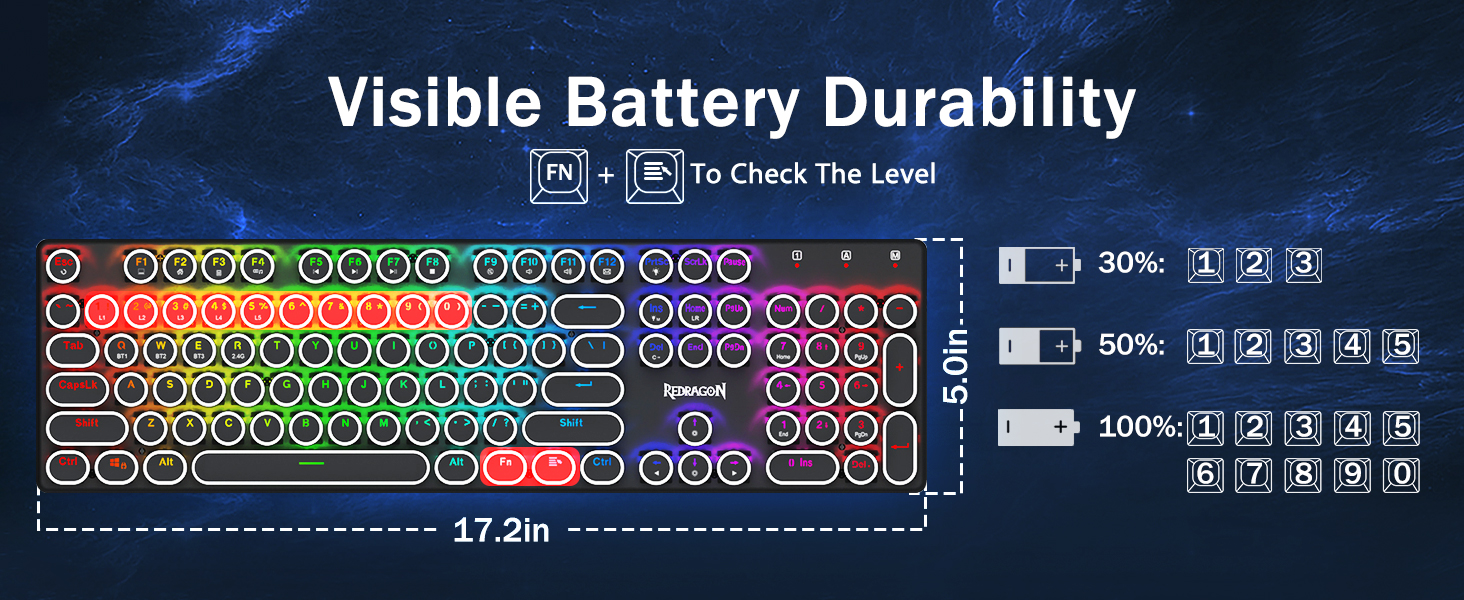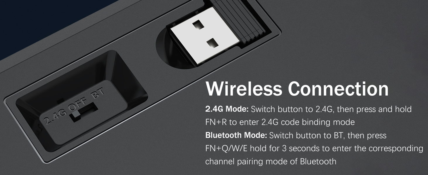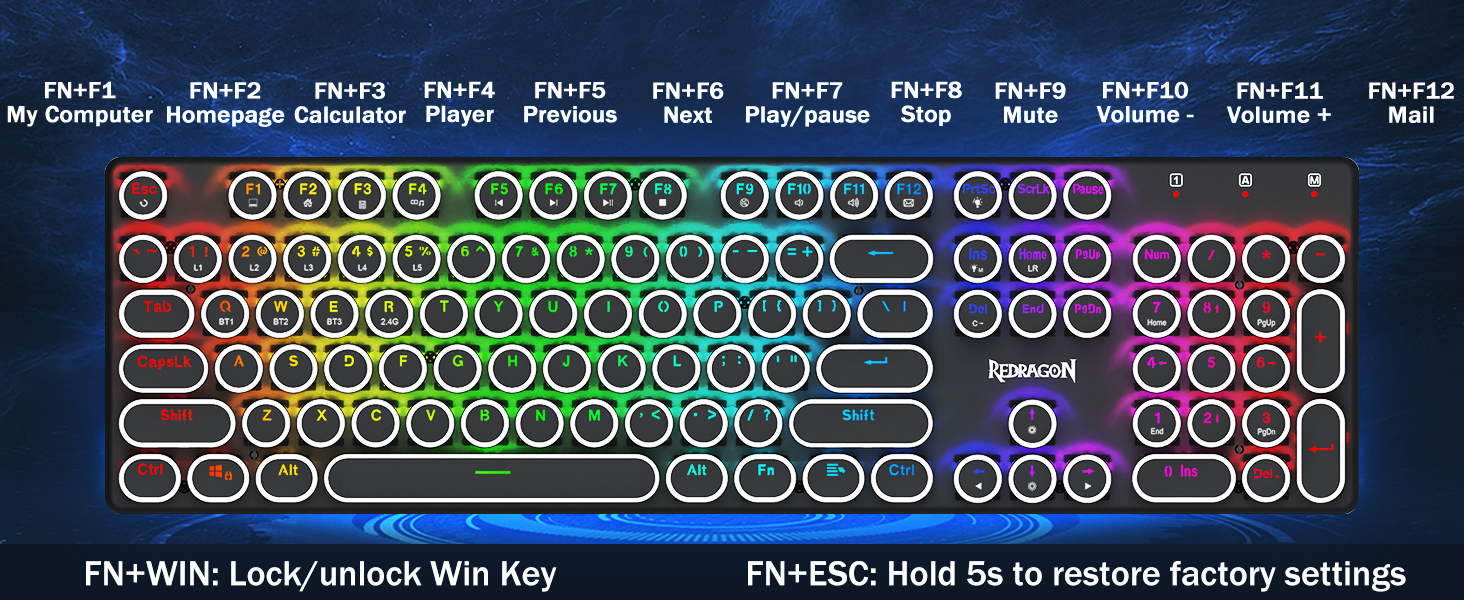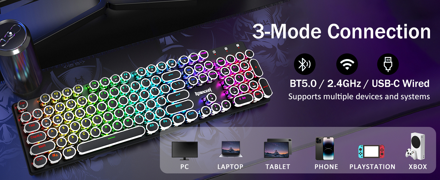 𝟯-𝗠𝗼𝗱𝗲 𝗖𝗼𝗻𝗻𝗲𝗰𝘁𝗶𝗼𝗻 -Оснащен инновационной технологией трехрежимного подключения Redragon, проводным режимом USB-C, Bluetooth 5.0/3.0 и беспроводным режимом 2,4 ГГц, что позволяет поднять качество обслуживания пользователя на новый уровень во всех областях. Нажмите FN+Q/W/E для перехода в режим Bluetooth, нажмите FN+R для перехода в режим 2,4G.