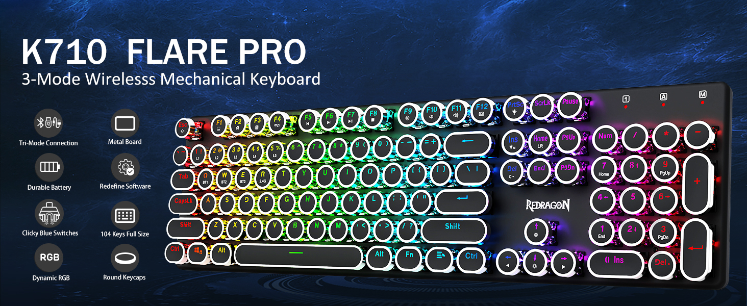 Chuangquan, ведущий китайский производитель, представляет беспроводную механическую игровую клавиатуру Redragon Black K710 в стиле пишущей машинки — сочетание винтажного дизайна и передовых характеристик. Благодаря тактильным синим переключателям, яркой RGB-подсветке и трехрежимному подключению эта клавиатура обеспечивает удобство игры и набора текста. Компания Chuangquan идеально подходит для оптовых закупок и предлагает конкурентоспособные заводские цены и надежную OEM/ODM-поддержку для мировых поставщиков, которым требуются качественные игровые периферийные устройства.