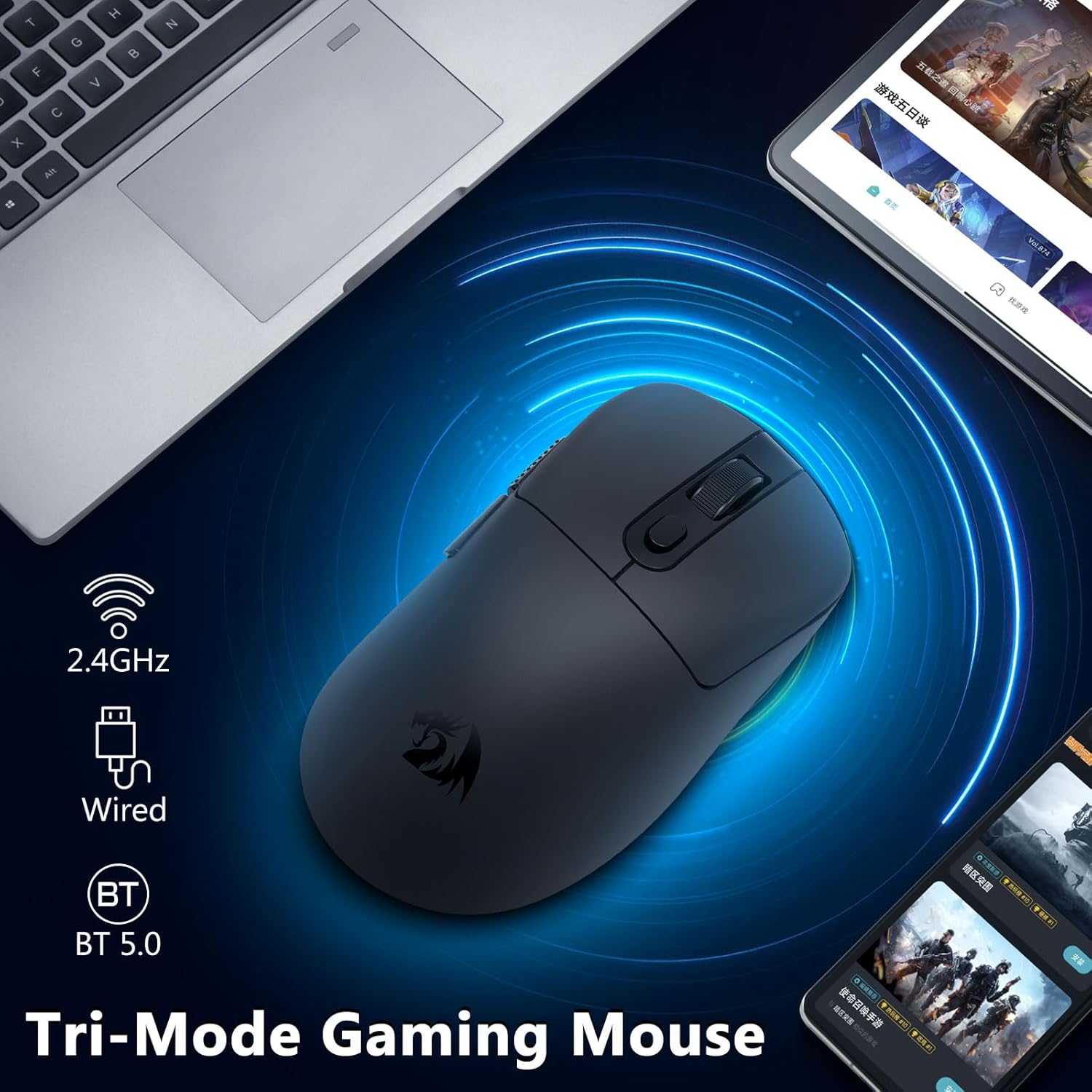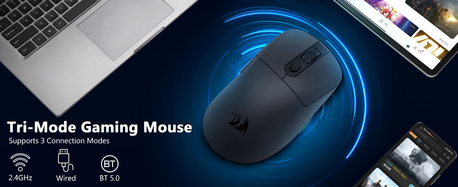 Благодаря уменьшенному весу и стабильной передаче сигнала эта мышь обеспечивает плавное движение и точное управление в различных сценариях использования. Его трехрежимное подключение позволяет пользователям переключаться между беспроводными и проводными вариантами, что делает его подходящим для игр, офисной работы и портативных устройств.