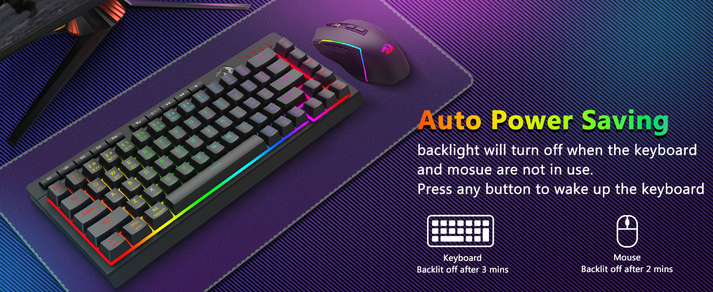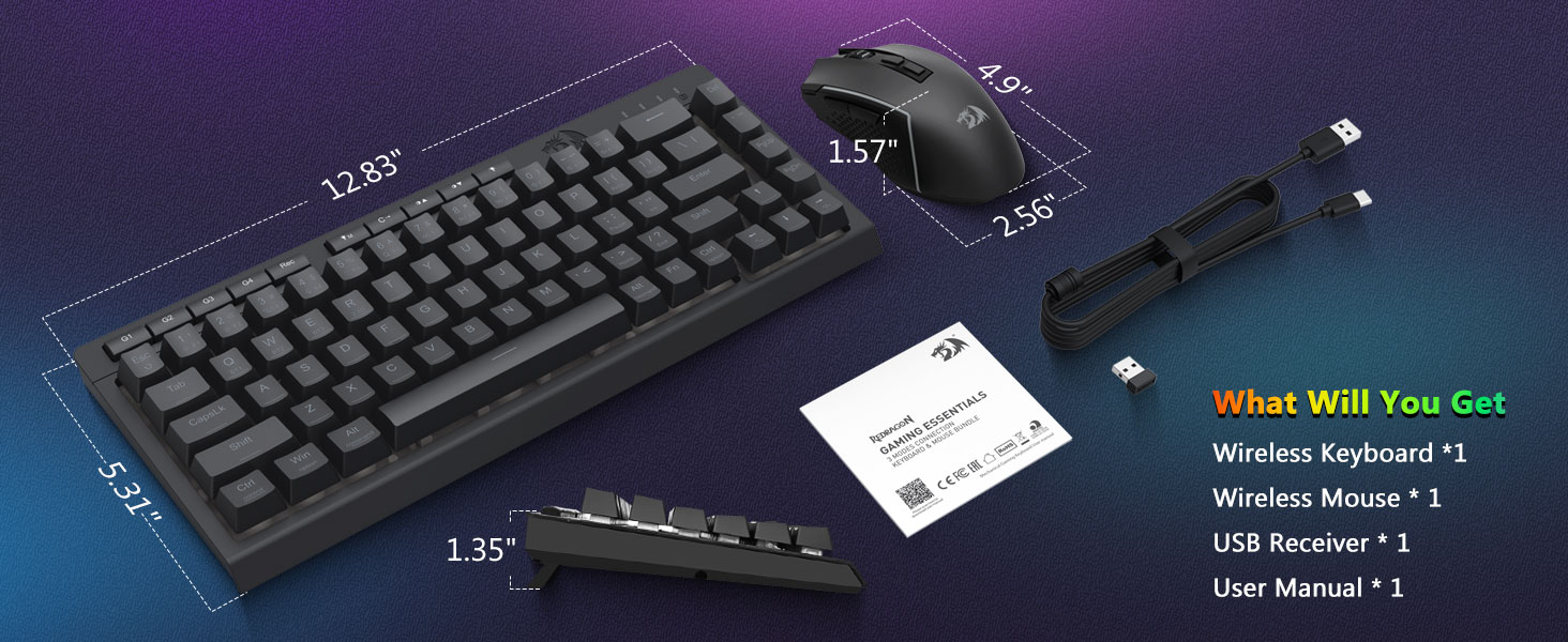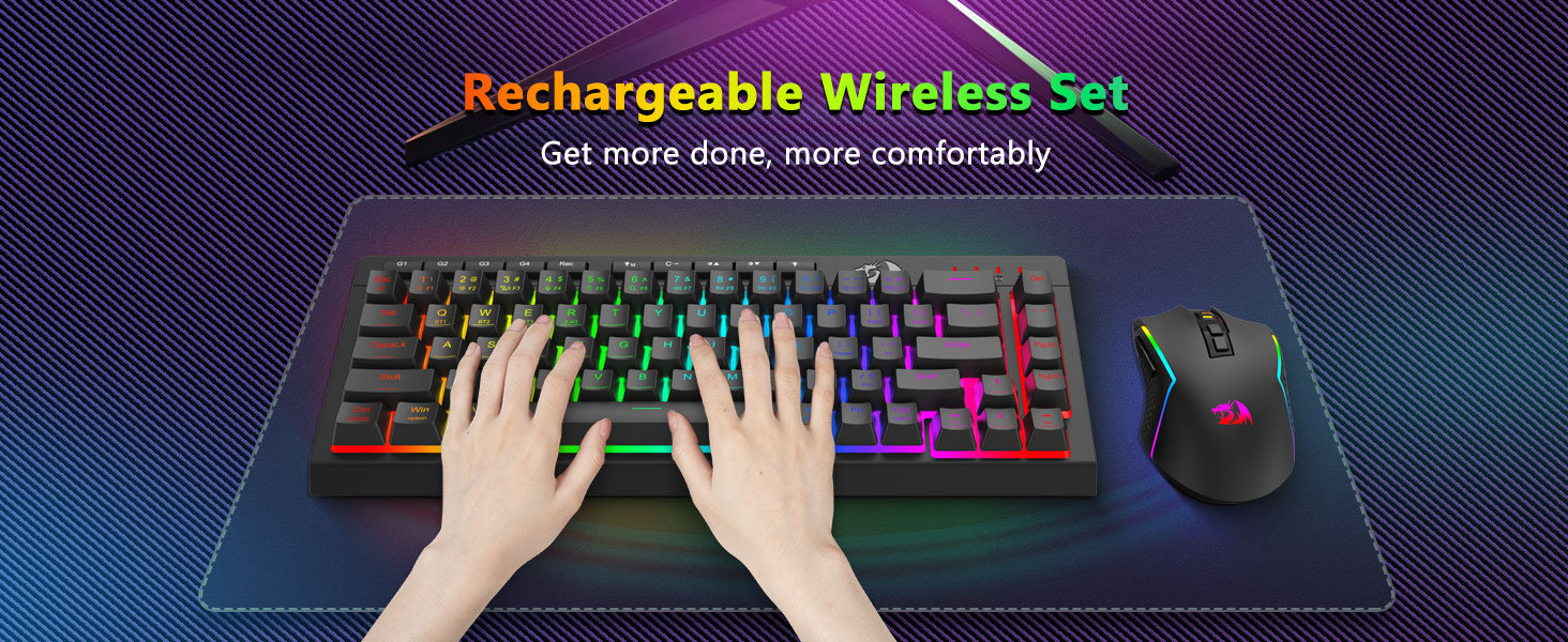 Беспроводная игровая клавиатура и мышь Black S157 от Redragon, искусно созданная профессиональным производителем Chuangquan, создана для того, чтобы улучшить вашу игровую станцию как по производительности, так и по стилю. Клавиатура обеспечивает приятный тактильный отклик, идеально подходящий как для интенсивных игровых марафонов, так и для длительных сеансов набора текста, а мышь обеспечивает высочайшую точность благодаря регулируемым настройкам DPI для превосходного управления в игре. Оба компонента оснащены очаровательной RGB-подсветкой, позволяющей настроить атмосферу вашей установки с помощью спектра цветов и динамических эффектов.