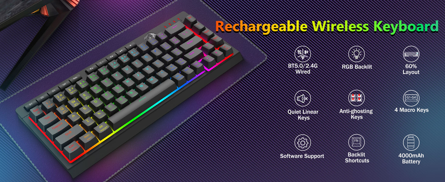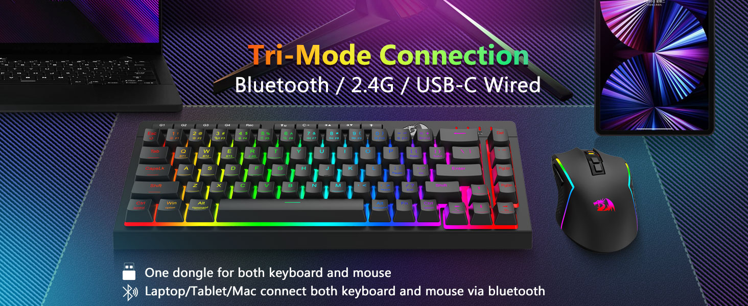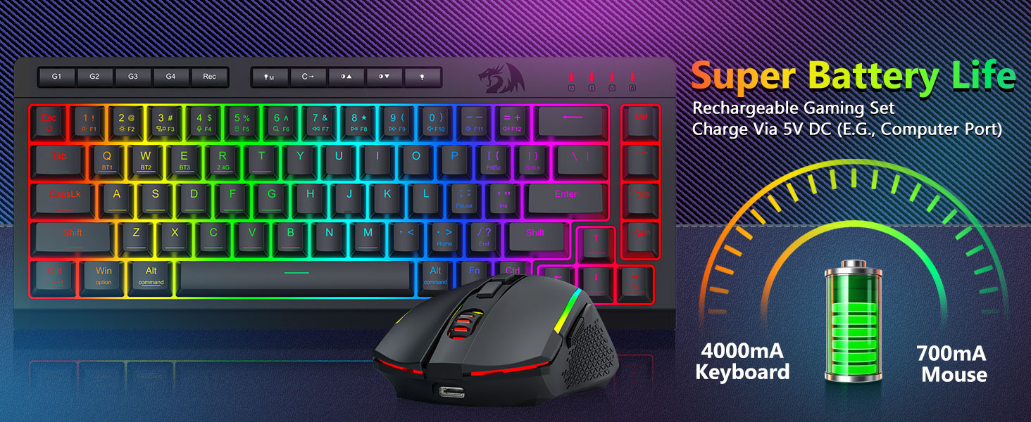 Трехрежимная универсальная клавиатура и мышь- Легко переключайтесь между беспроводными режимами Bluetooth 5.0, 2,4 ГГц или проводным USB-C, подключаясь к различным устройствам (ПК, Mac, планшетам, телефонам, PS/XBOX). Легко переключайте устройства с помощью сочетаний клавиш или боковой кнопки — идеально подходит для гибридных настроек работы и игр. Оставайтесь на связи в течение нескольких недель благодаря аккумуляторной клавиатуре емкостью 4000 мАч и мыши емкостью 700 мАч (30+ дней в режиме ожидания, 50 часов работы в режиме RGB).