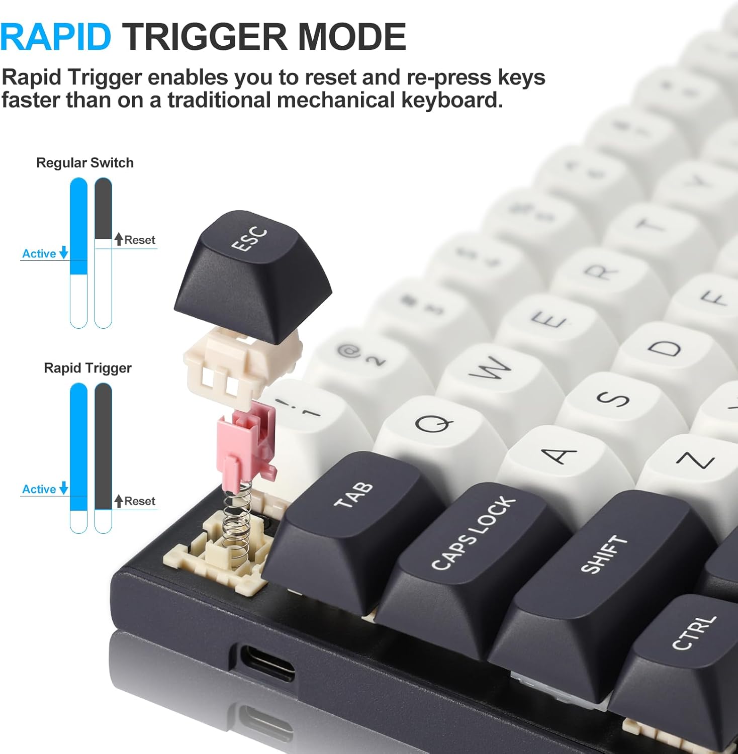 Бело-сине-черная механическая игровая клавиатура K701 Rapid Trigger 60% с проводным магнитным переключателем предназначена для пользователей, которые отдают предпочтение точности, скорости и компактному форм-фактору. Сочетание технологии магнитного переключателя, функции быстрого запуска и прочной конструкции делает его надежным вариантом как для игр, так и для продуктивной работы.