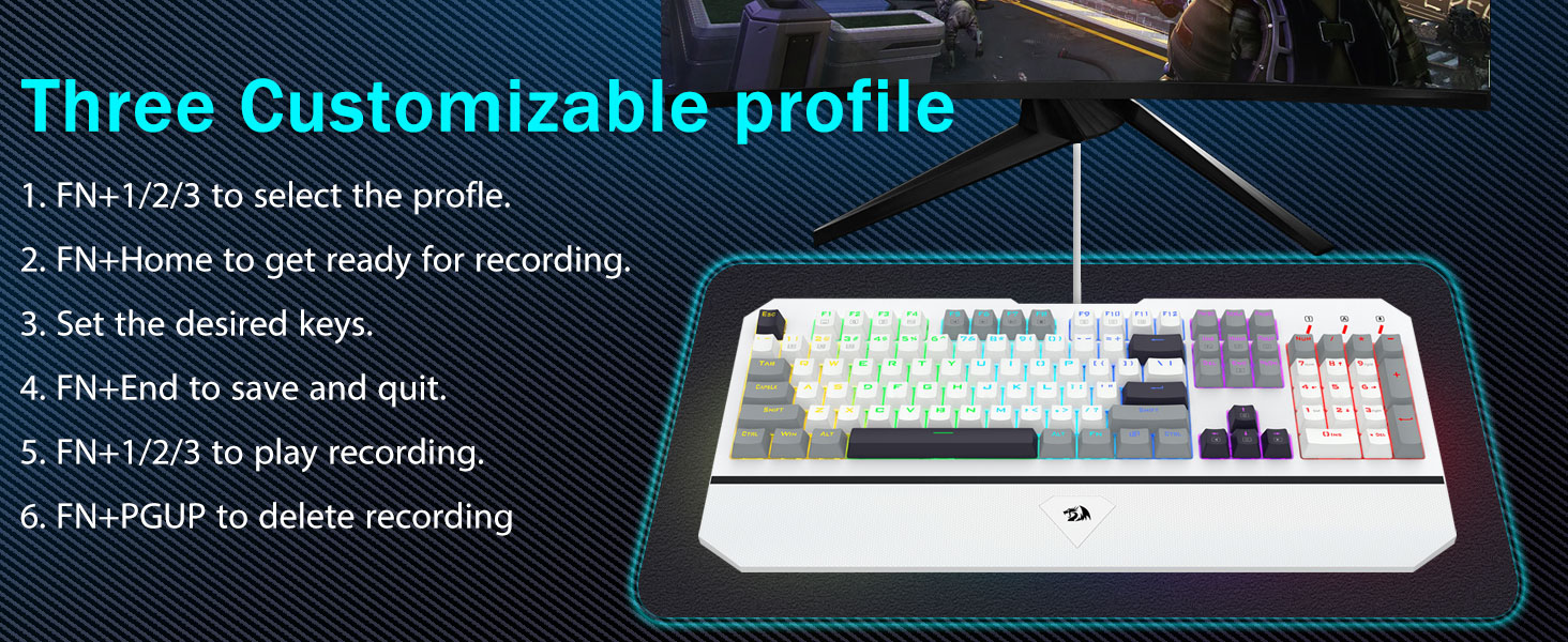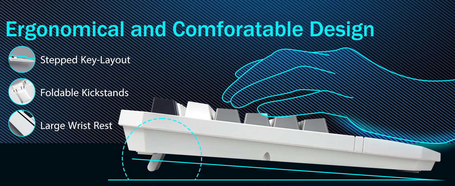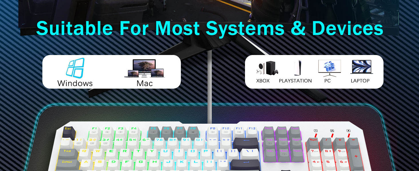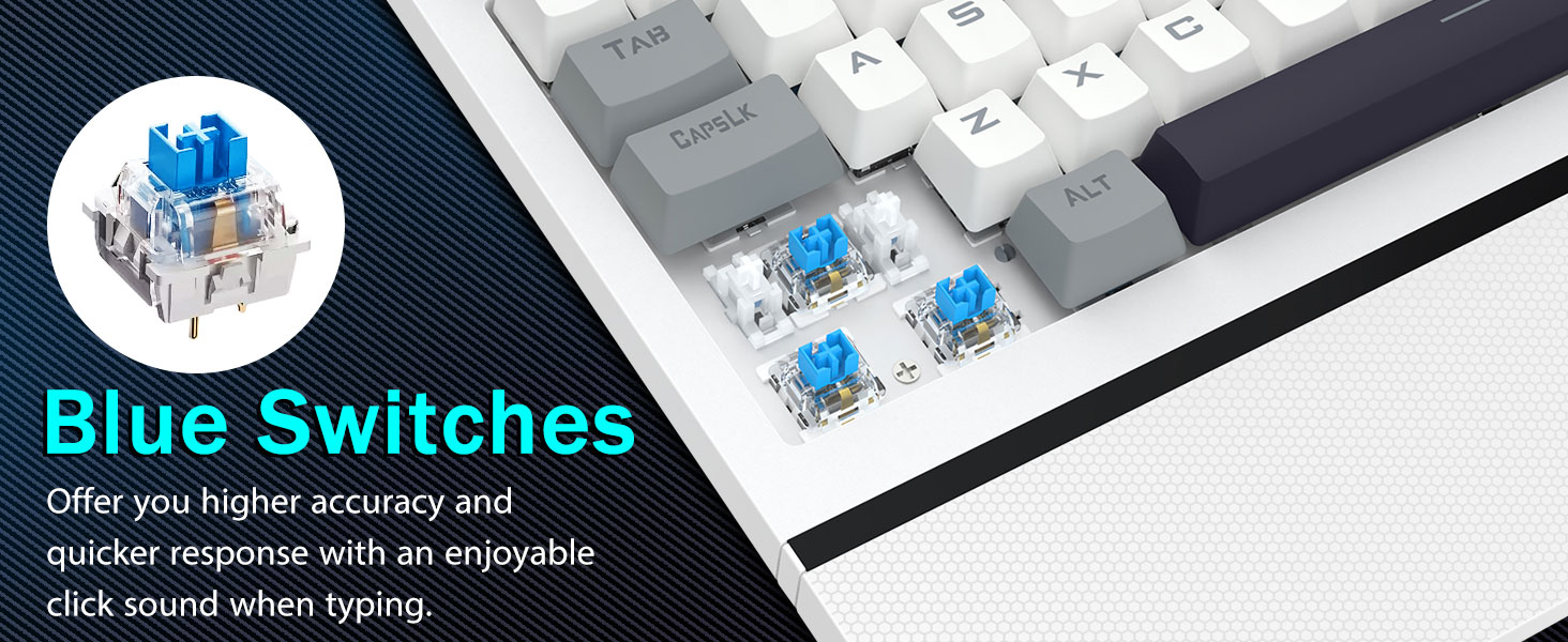 【Отзывчивые синие переключатели для точного набора текста】Наша клавиатура ПК оснащена щелкающими синими переключателями, которые обеспечивают молниеносное время отклика и поразительную точность. Каждое нажатие клавиши издает приятный щелчок, улучшая качество набора текста. Благодаря более глубокому ходу клавиш, более сильной обратной связи и более широкому расстоянию между клавишами набор текста становится не только более точным, но и гораздо более удобным. Если вам нравится тактильное ощущение «щелкания», наша клавиатура — идеальный выбор для вас.