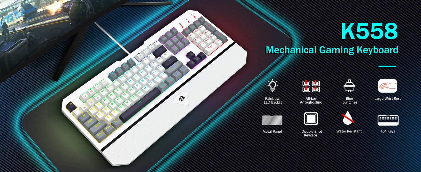 【100% защита от ореолов и 11 мультимедийных ярлыков】Наслаждайтесь плавным набором текста благодаря технологии 100% защиты от ореолов, которая позволяет всем клавишам регистрироваться одновременно, независимо от того, как быстро вы печатаете. С помощью 11 сочетаний мультимедийных клавиш вы можете быстро получить доступ к таким функциям, как калькулятор, управление мультимедиа и регулировка громкости. Механическая игровая клавиатура K558 с цифровой клавиатурой повышает вашу производительность. Совместимая с Windows 7/8/10/XP/VISTA/95/98/2000/ME и Mac OS, Xbox и т. д., эта клавиатура имеет срок службы до 50 миллионов нажатий клавиш.