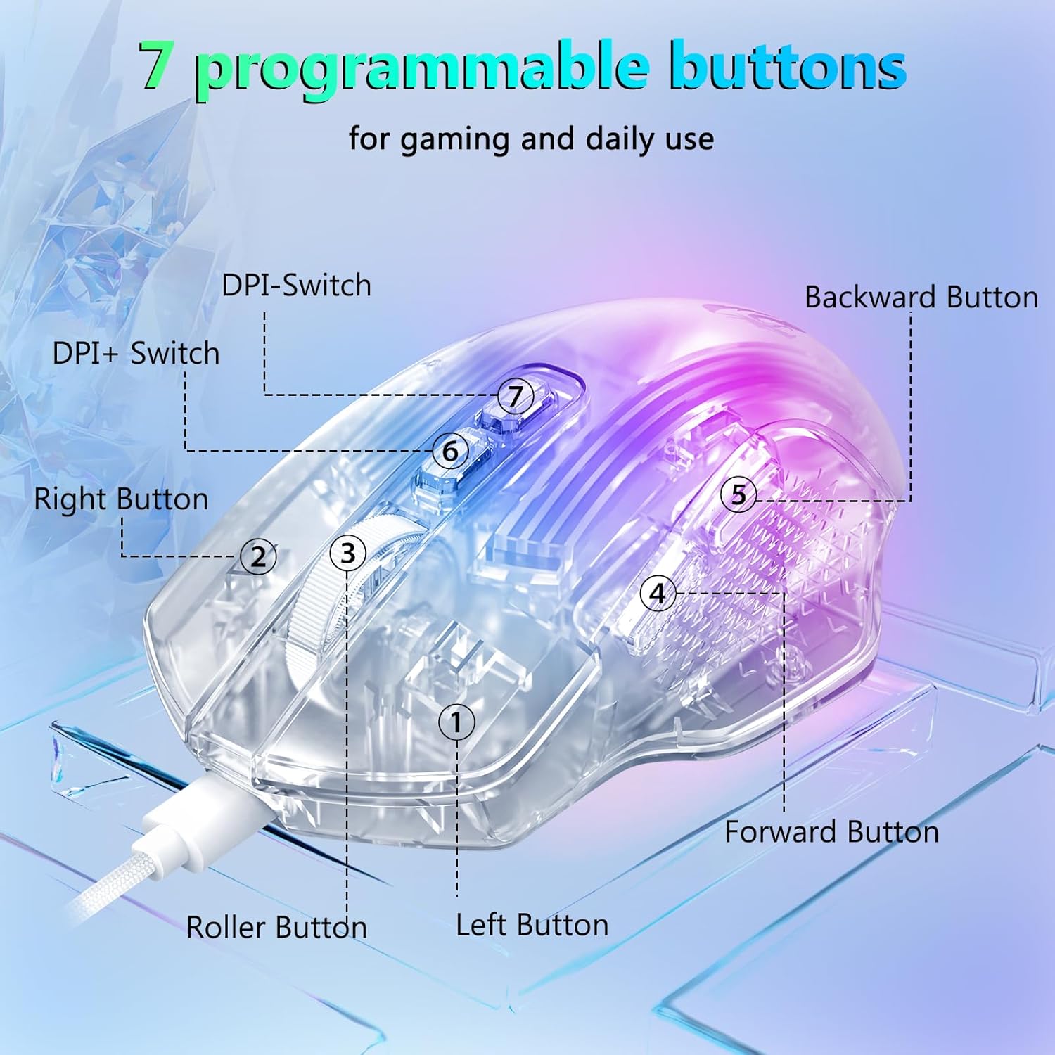 Проводная игровая мышь CHUANGQUAN White M695CT с 8 светодиодной подсветкой RGB и разрешением 24 000 точек на дюйм обеспечивает сверхточное отслеживание, плавное управление и динамическую подсветку, созданную для геймеров, которым требуется скорость, точность и стиль.