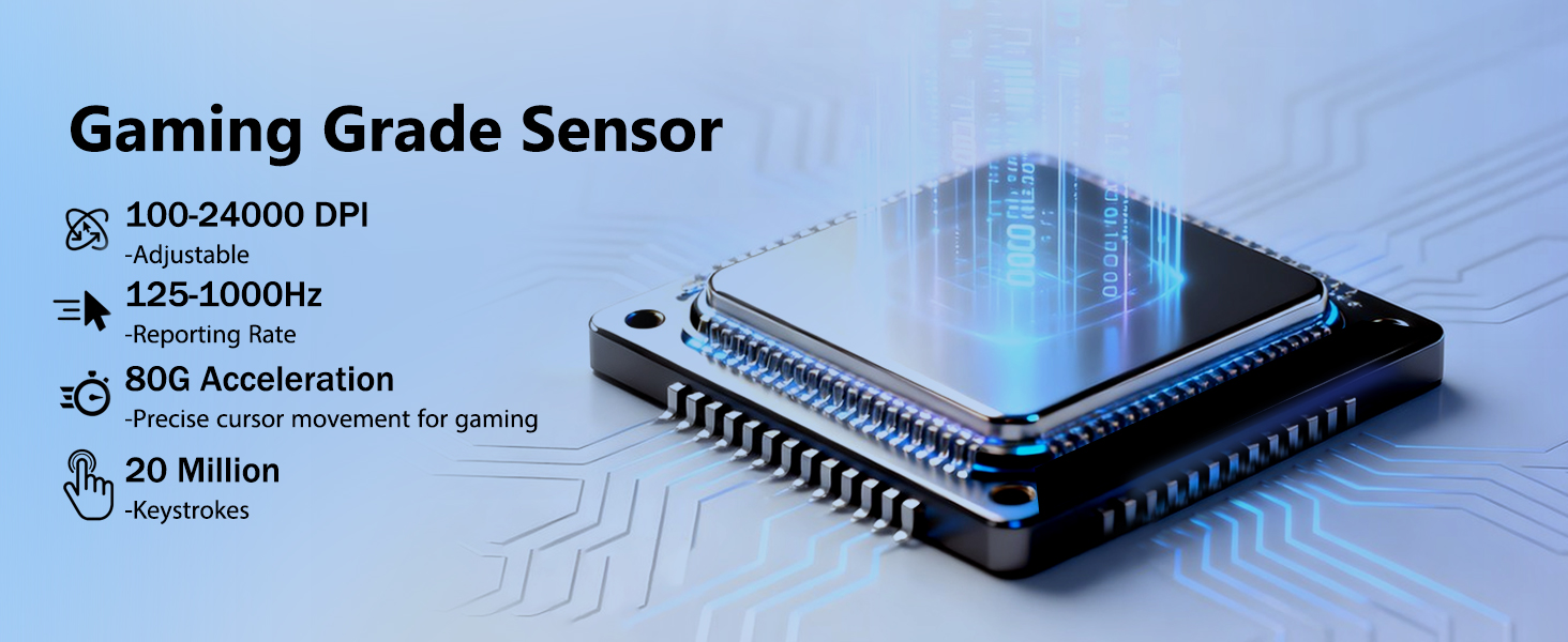 Мышь оснащена усовершенствованным оптическим датчиком, обеспечивающим разрешение до 24 000 точек на дюйм. Это позволяет пользователям настраивать чувствительность в соответствии с различными сценариями: от точного нацеливания в играх до быстрого перемещения курсора по большим экранам.
