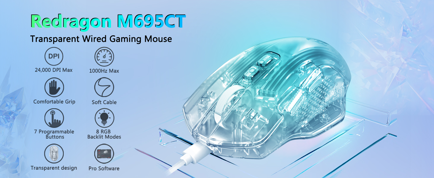Белая проводная игровая мышь M695CT с разрешением 24 000 точек на дюйм и 8 RGB-подсветкой со светодиодной подсветкой и практичным набором функций — это надежный выбор для пользователей, которым требуется стабильный контроль и эффективная производительность в современных вычислительных средах.